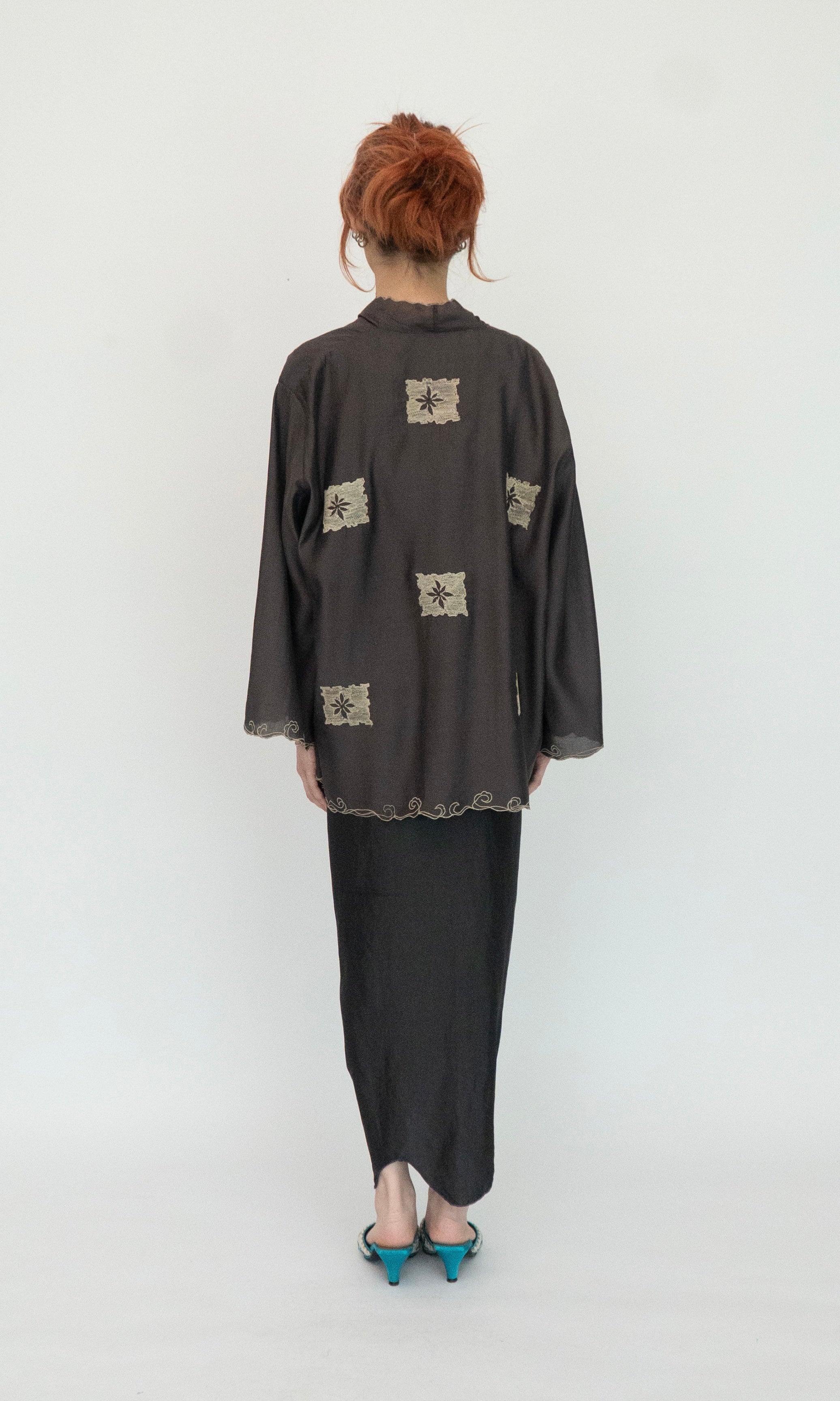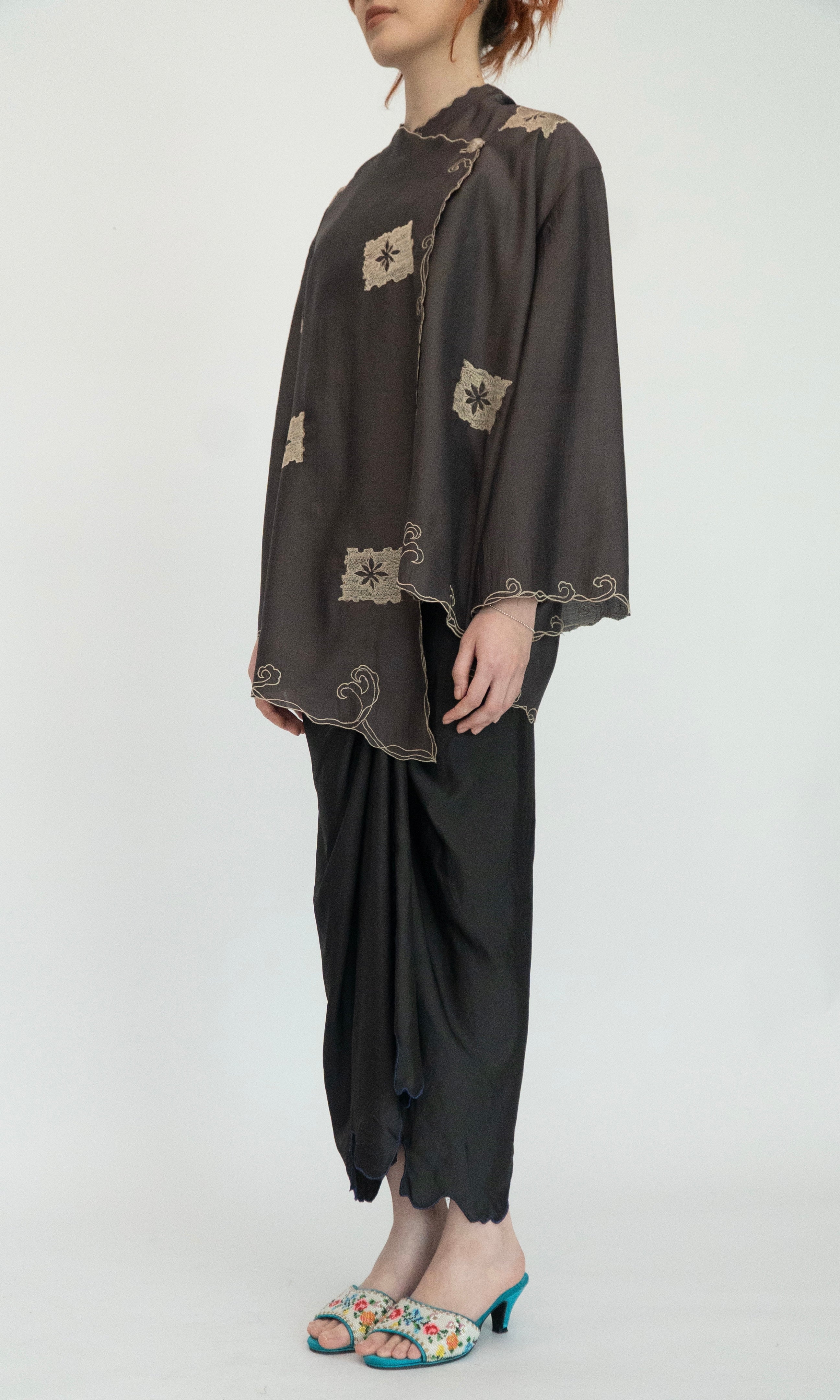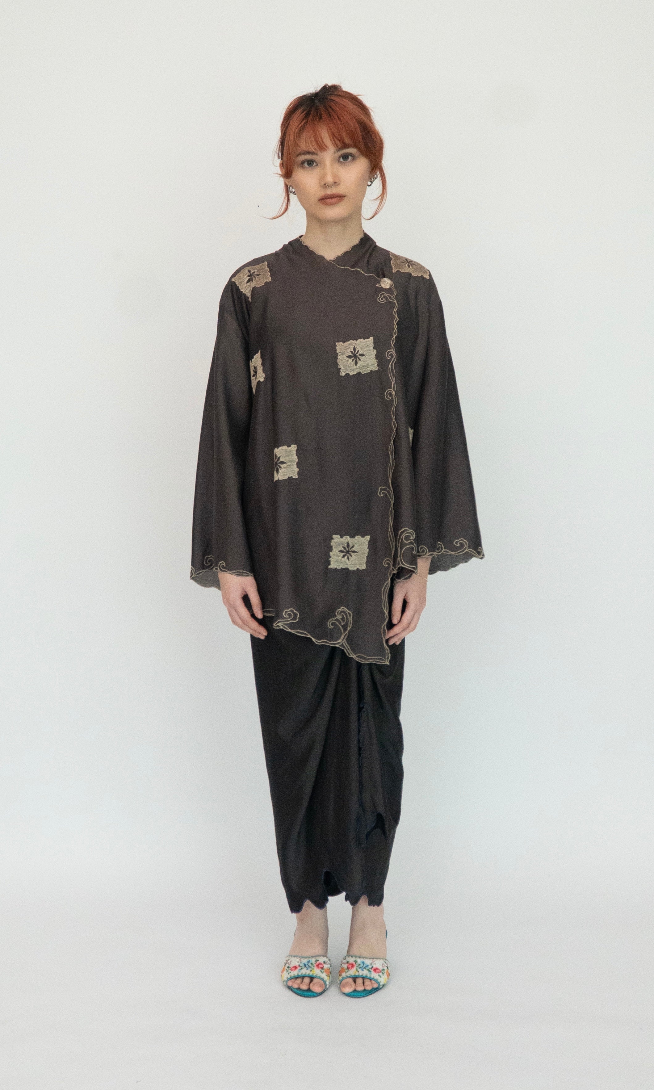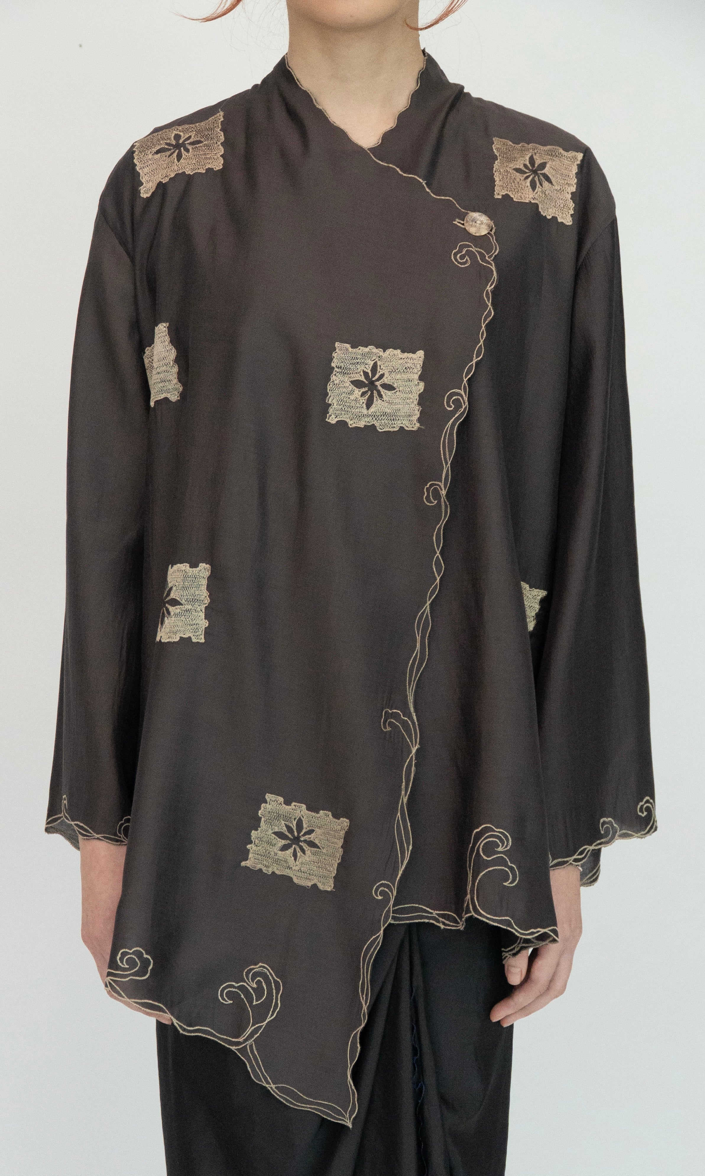 - Loose cut drop-shoulder short kebaya.
