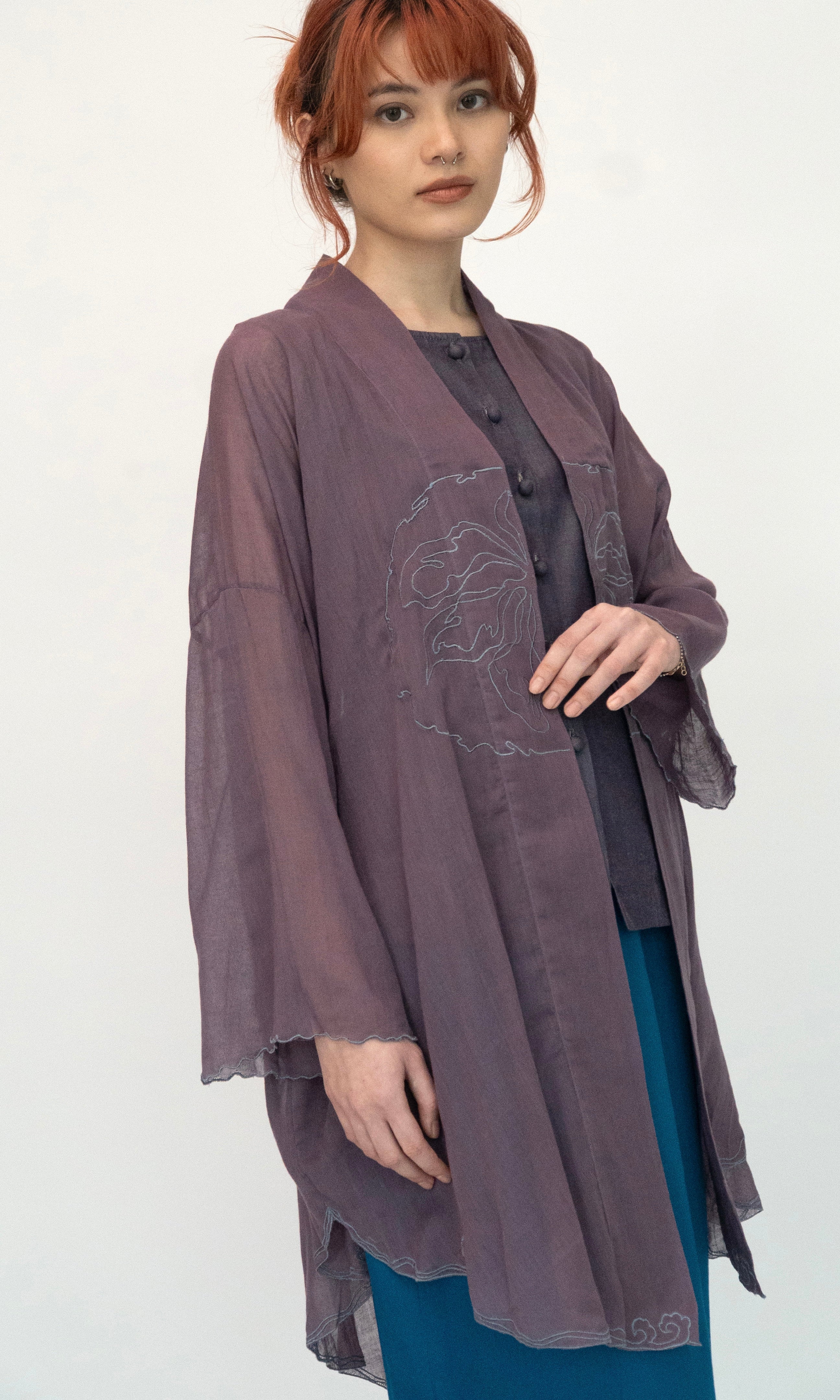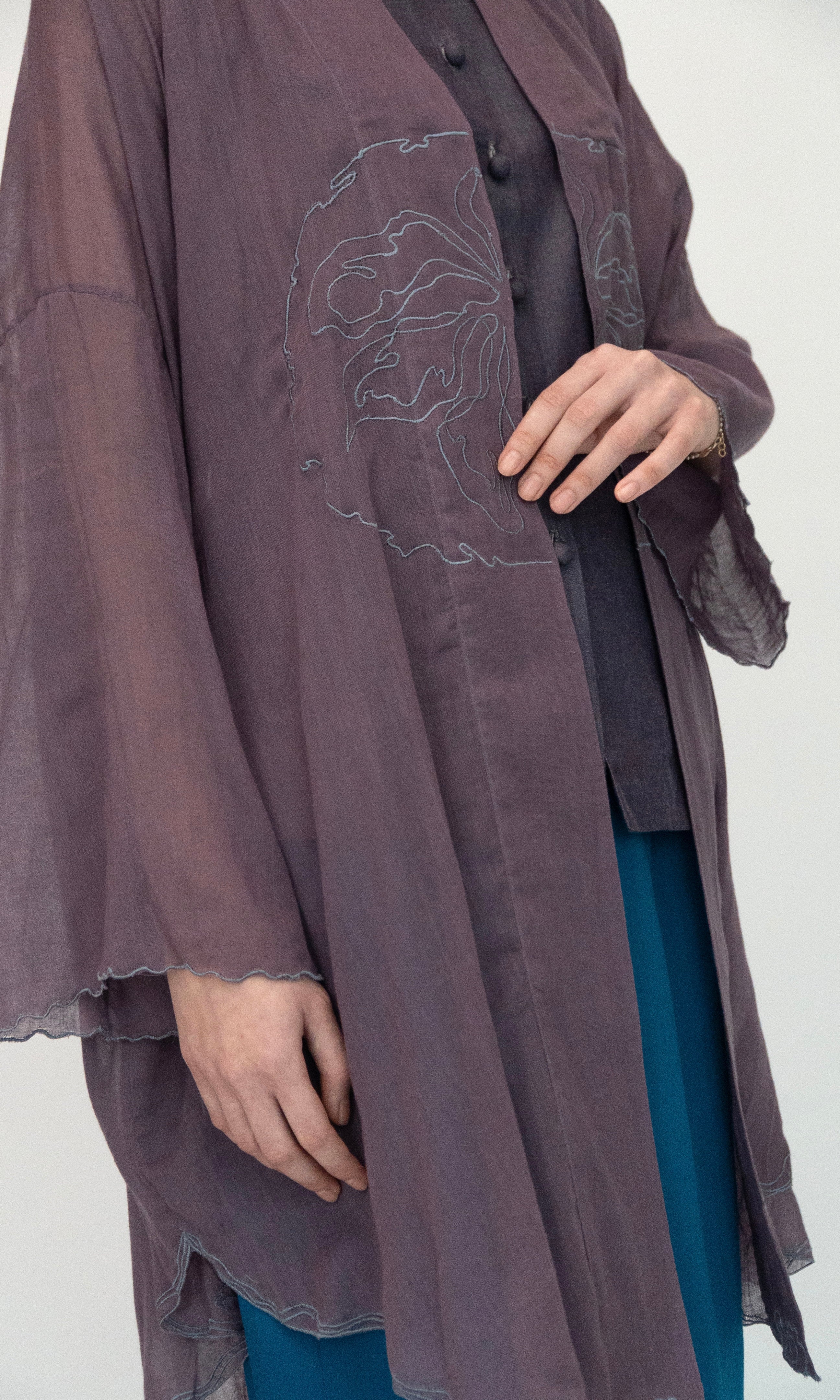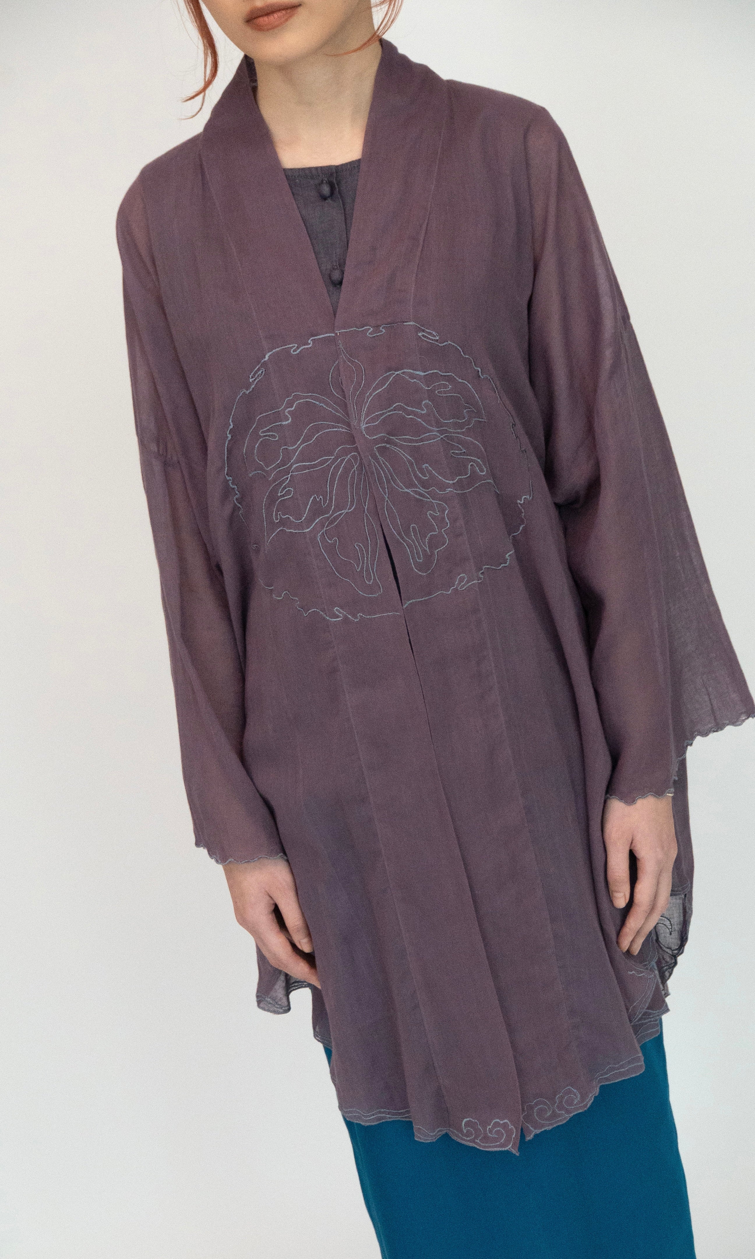 - Embroidery detail along the sleeve openings and hemline.