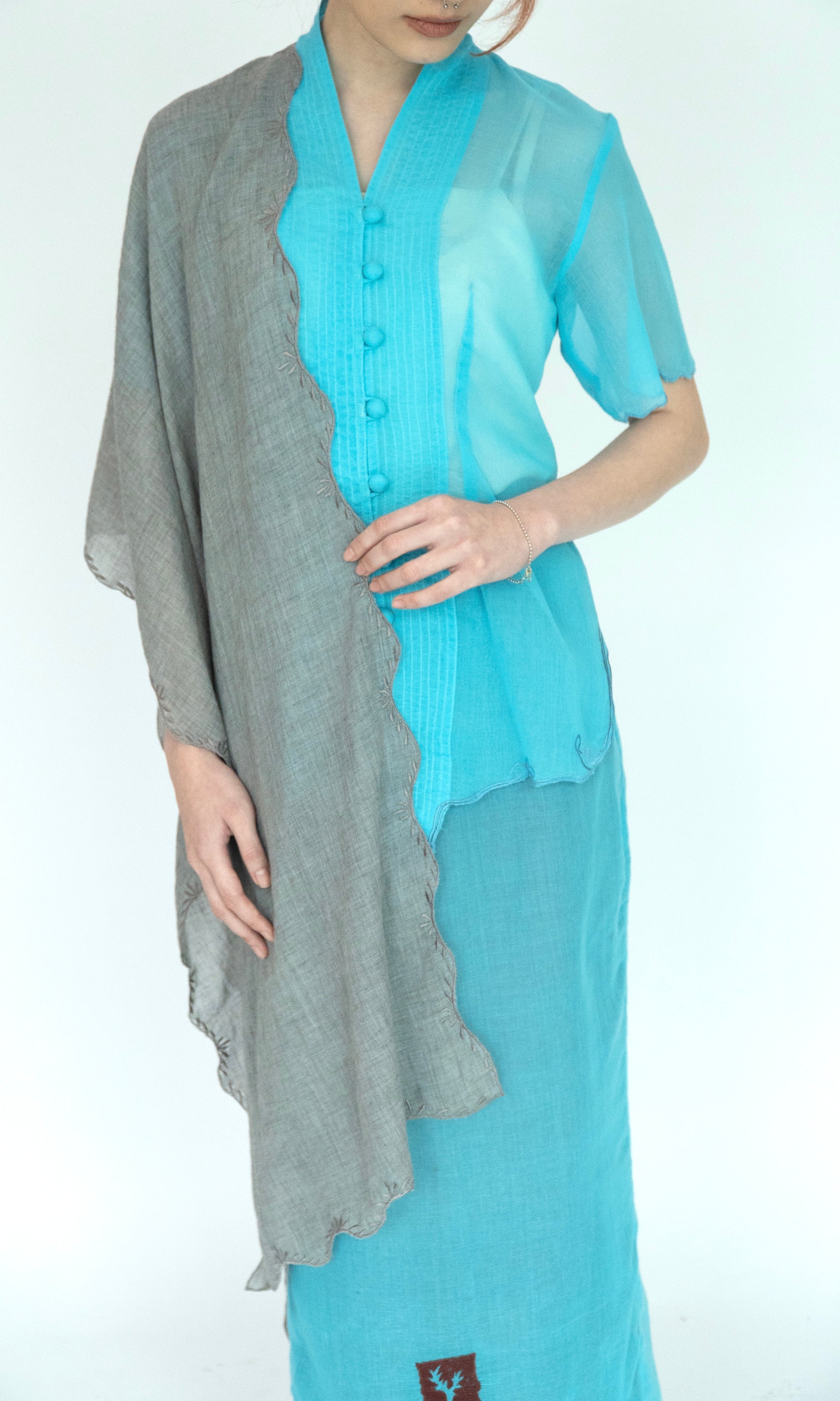 - Embroidery details along the sleeve openings and hemline.