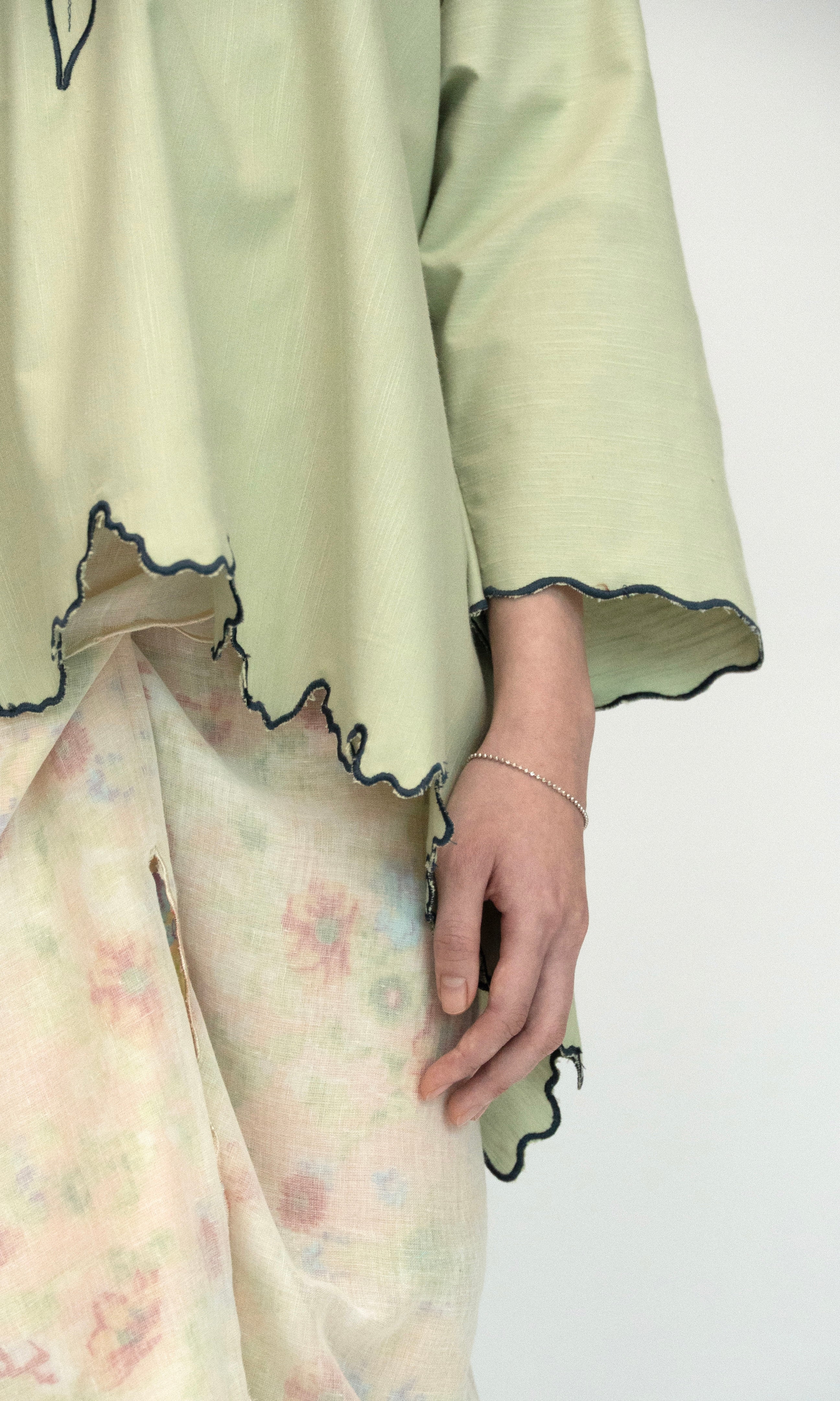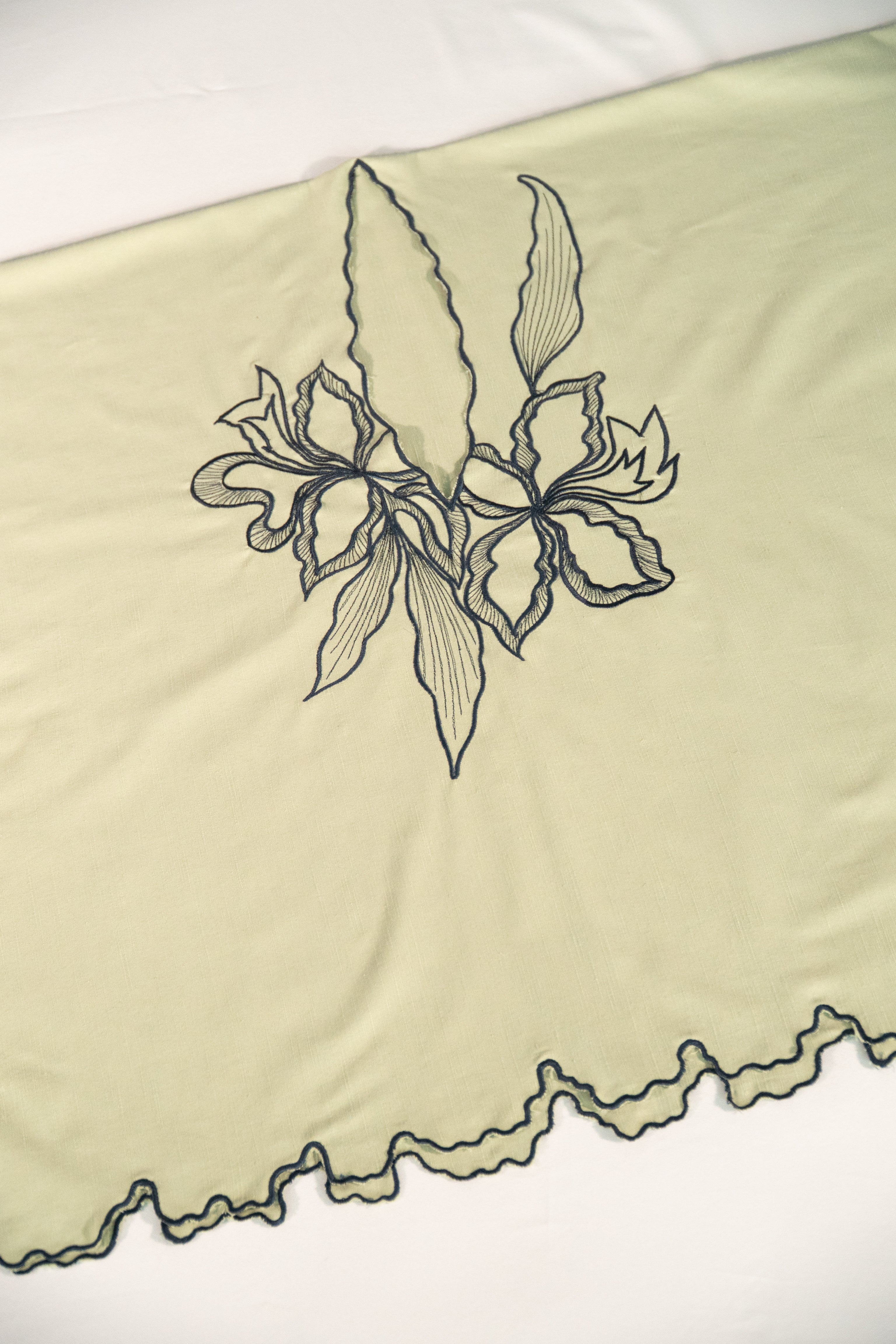 - Embroidery detail along all edges.