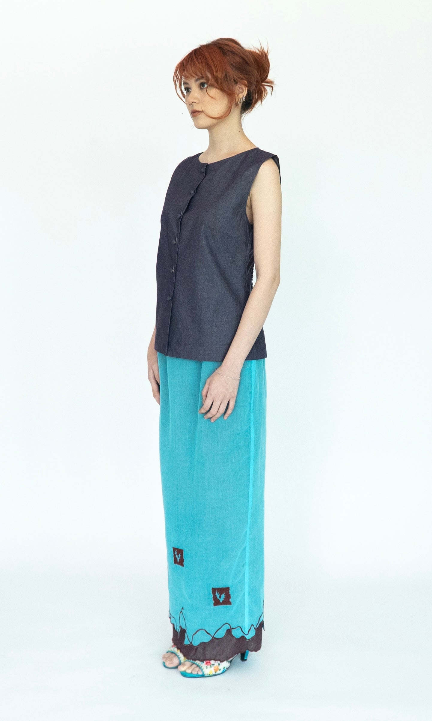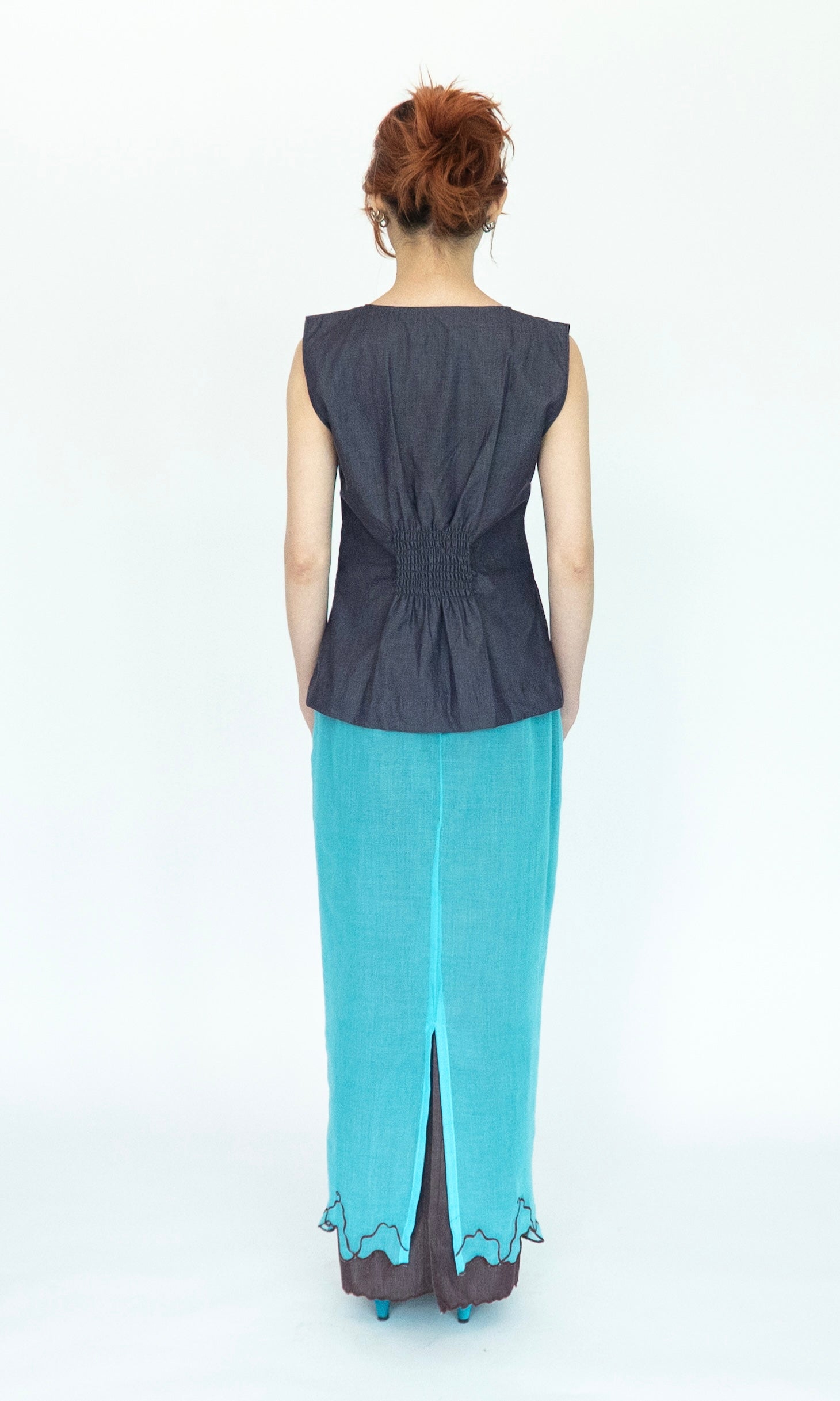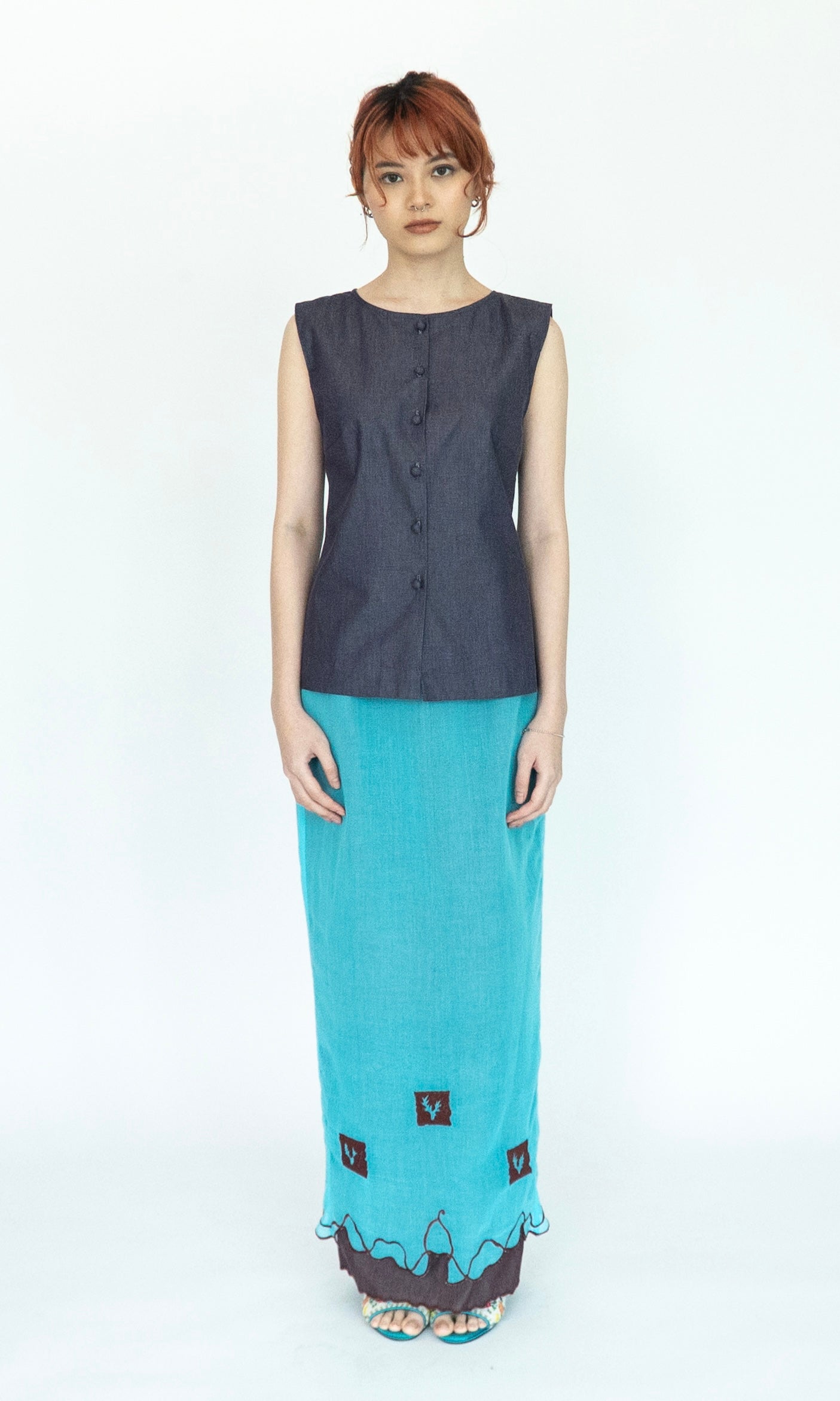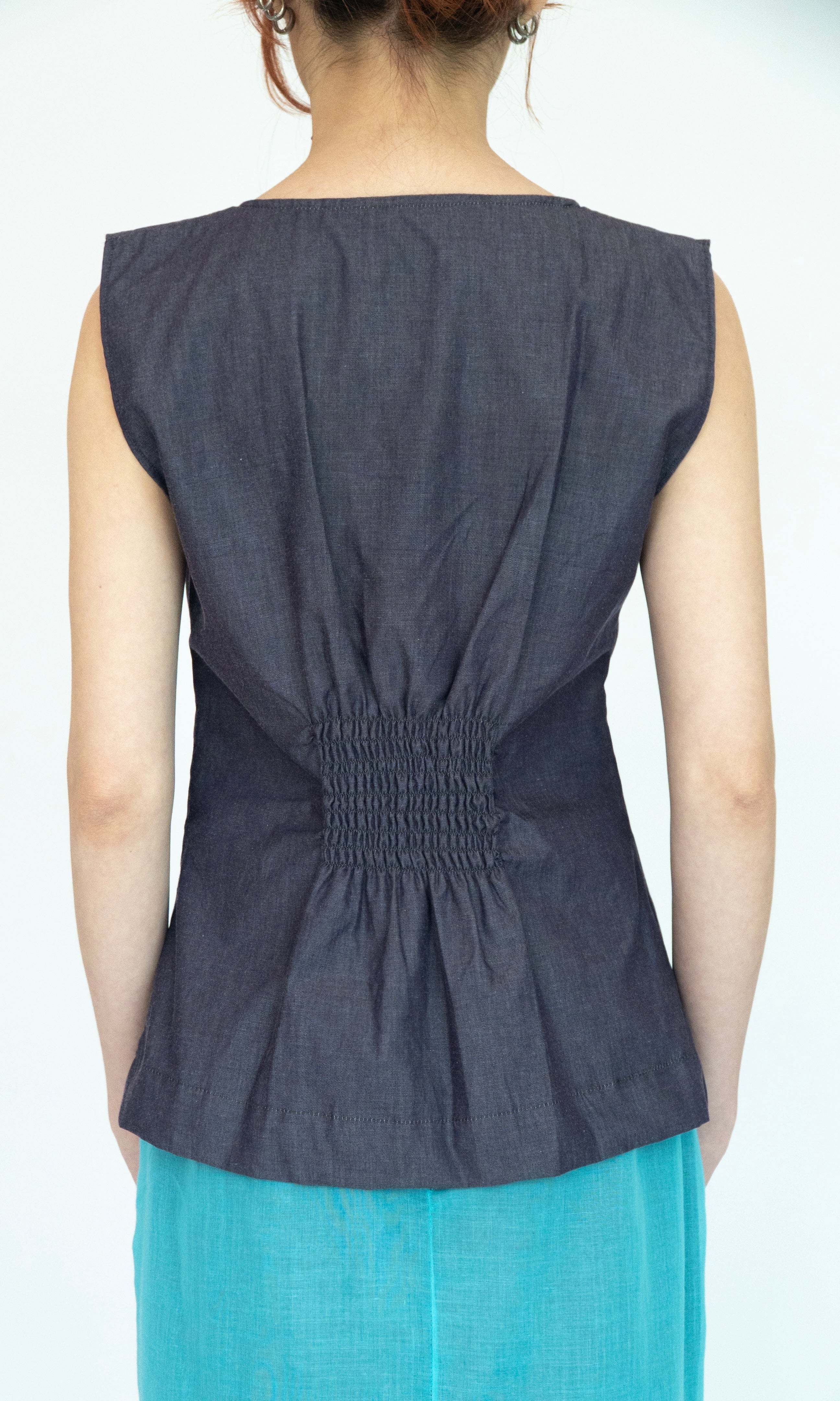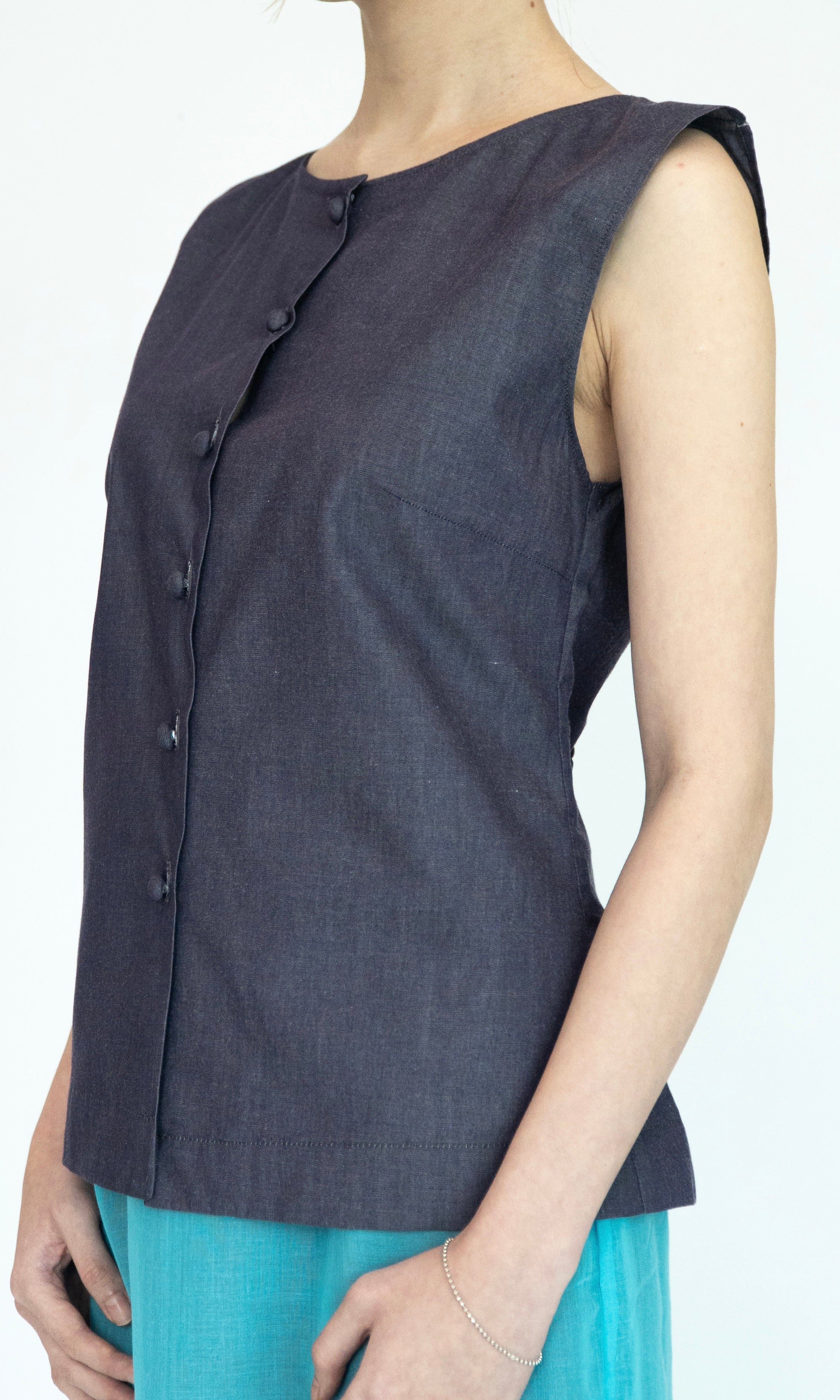 - Sleeveless top with bust darts.